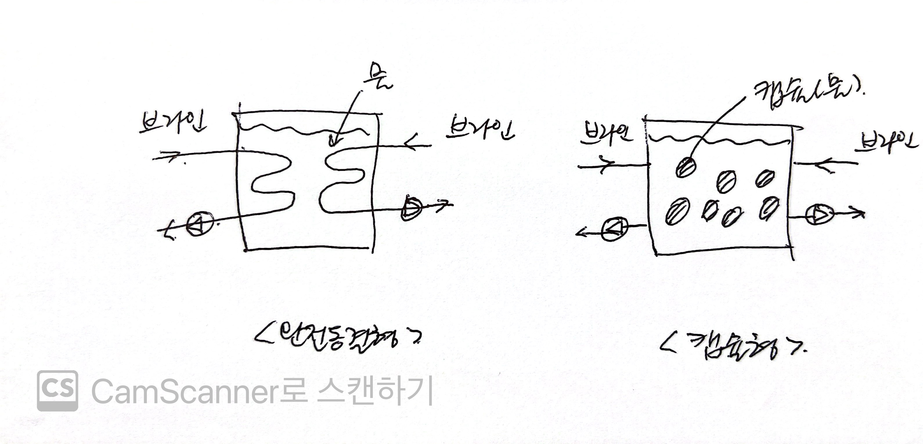 - 액체식 빙생성형 : 브라인 수용액에서 물이 냉각되어 슬러리로 변화하면서 얼음이 생성되는 방식